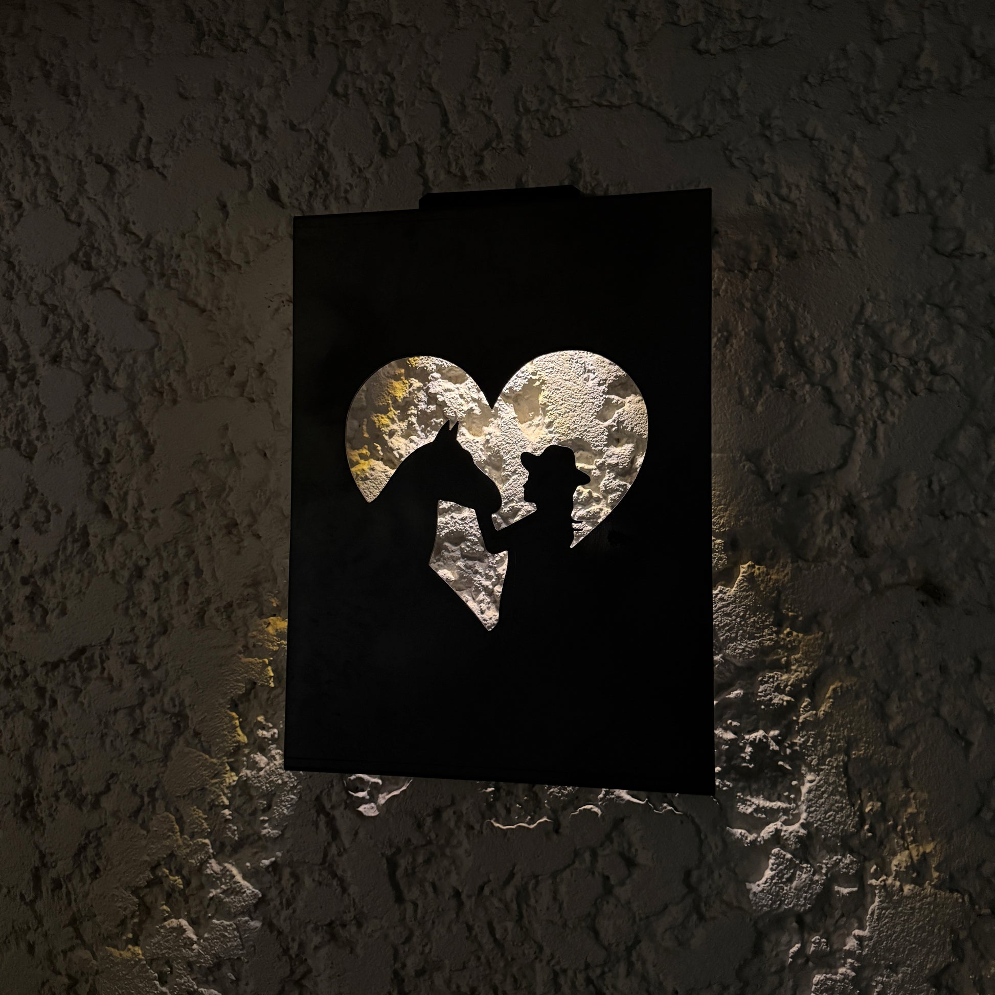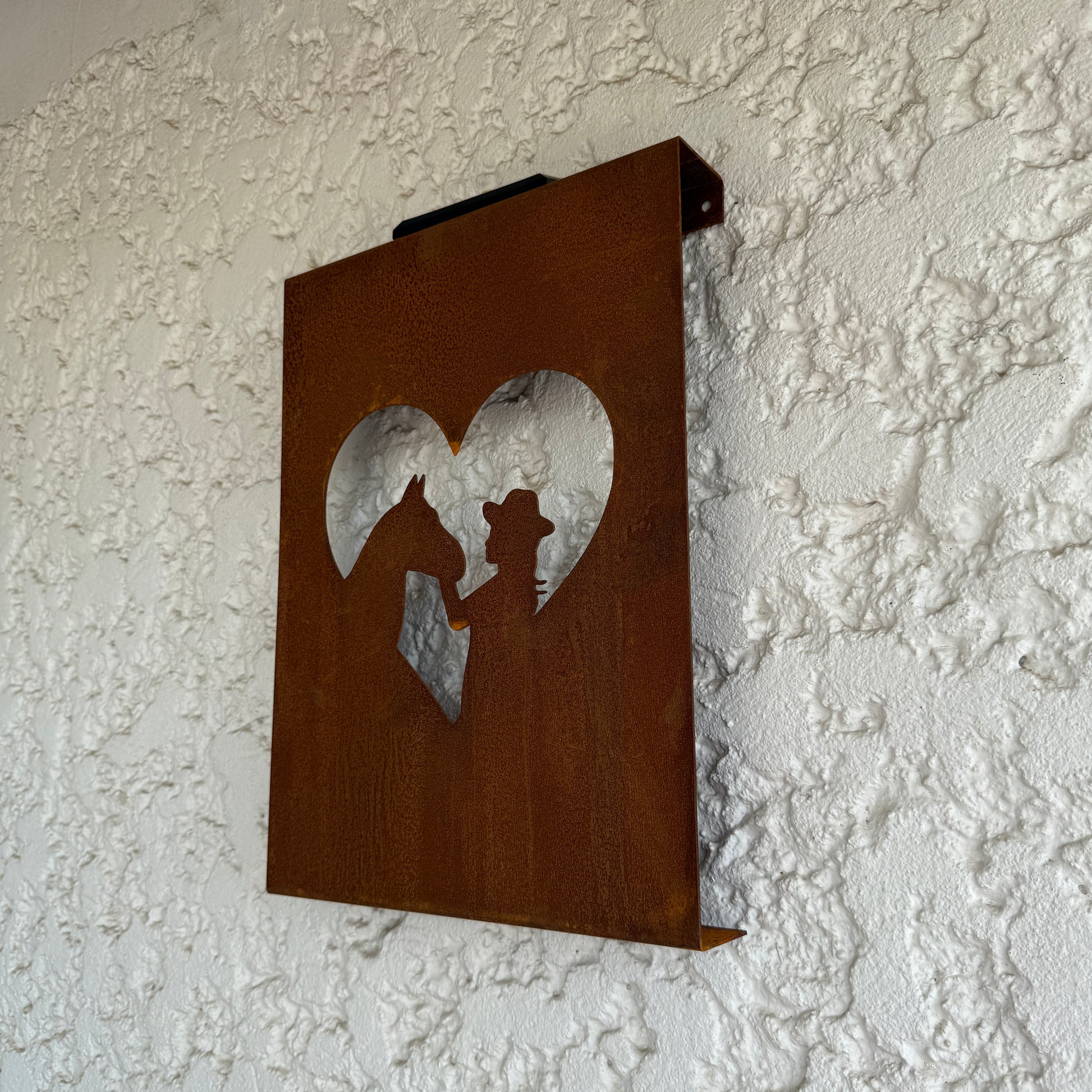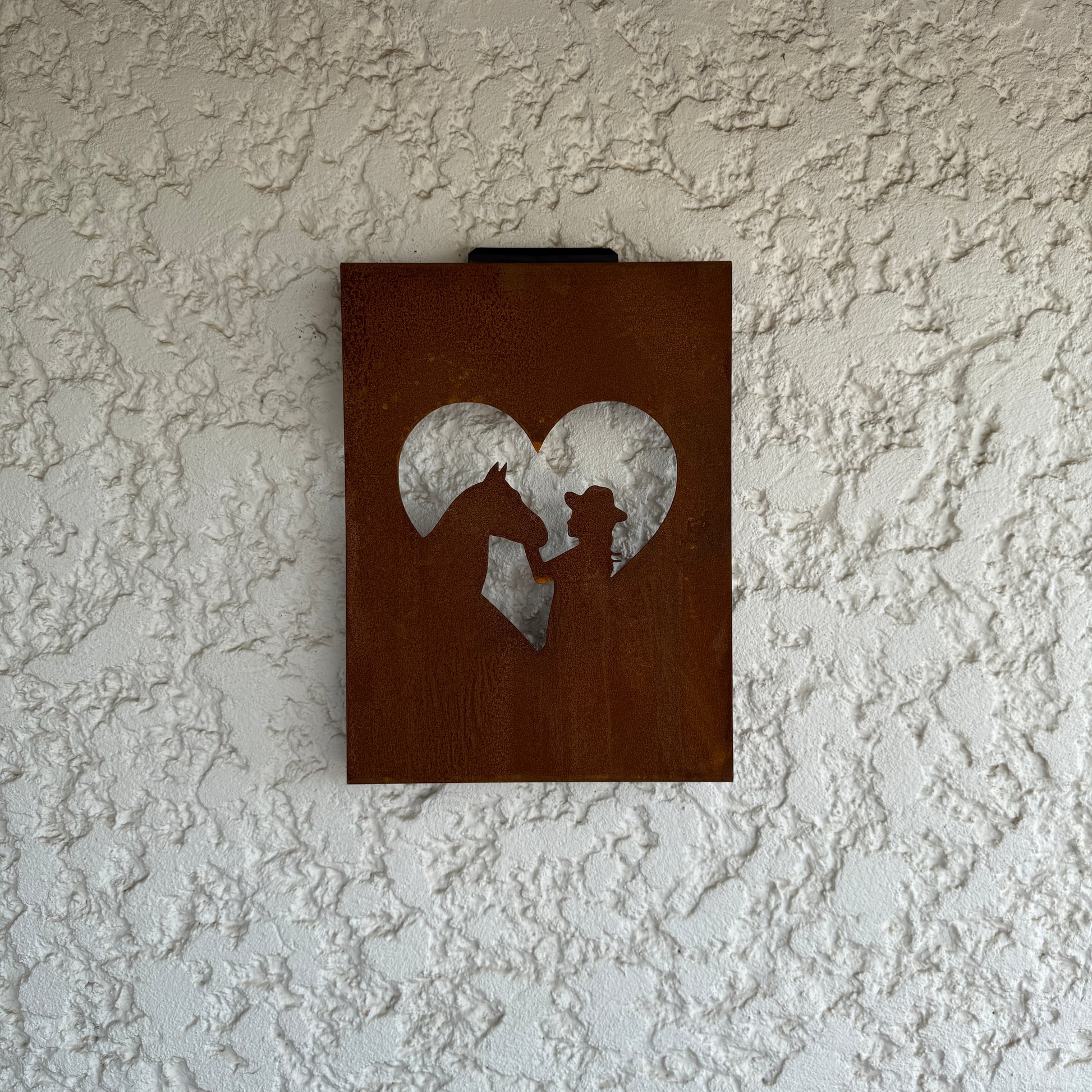 Iluminá tu entrada, galería o jardín con una pieza de diseño en acero corten 2 mm. La luz cálida 3000 K resalta el calado del Jinete y el Caballo hasta 8 h por noche. Sin cables y lista para colgar.